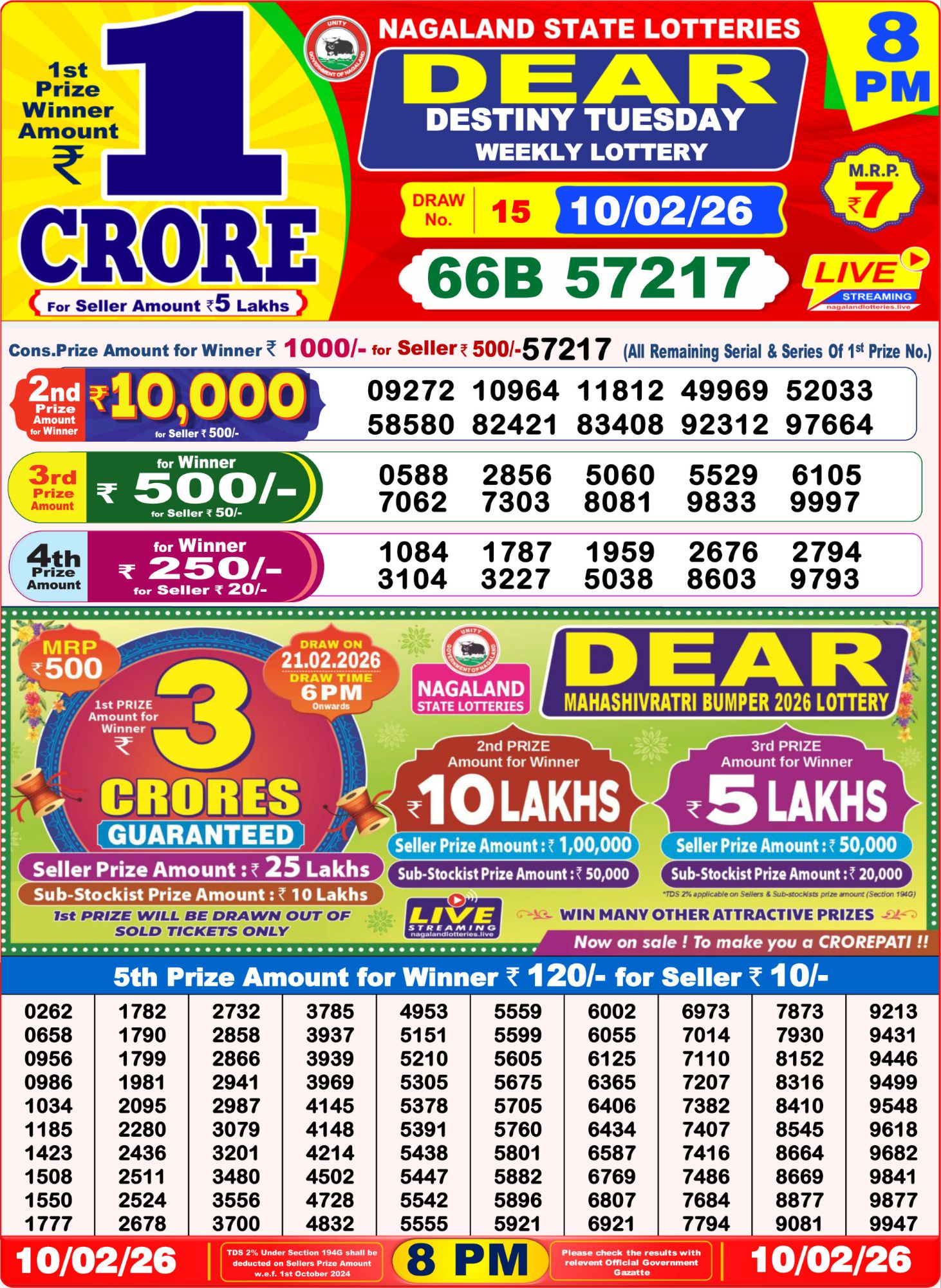 Nagaland Lottery Sambad Result for Dear Destiny Tuesday weekly lottery result 8 PM – 10/02/2026 is now published here. Check Your Numbers Here.