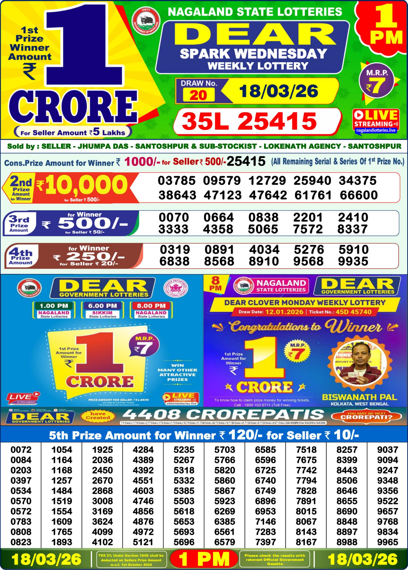 Nagaland Lottery Sambad Result for Dear Spark Wednesday weekly lottery result 1 PM – 18/03/2026 is now published here. Check Your Numbers Here.