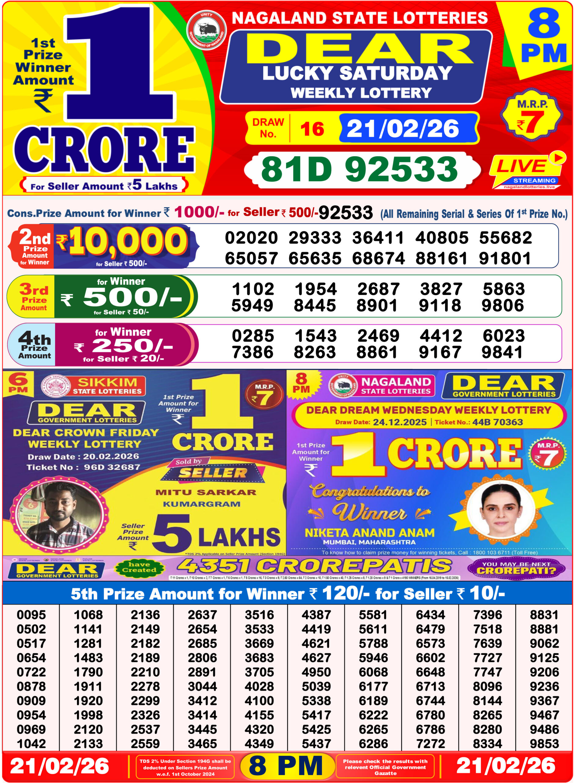 Nagaland Lottery Sambad Result for Dear Lucky Saturday weekly lottery result 8 PM – 21/02/2026 is now published here. Check Your Numbers Here.