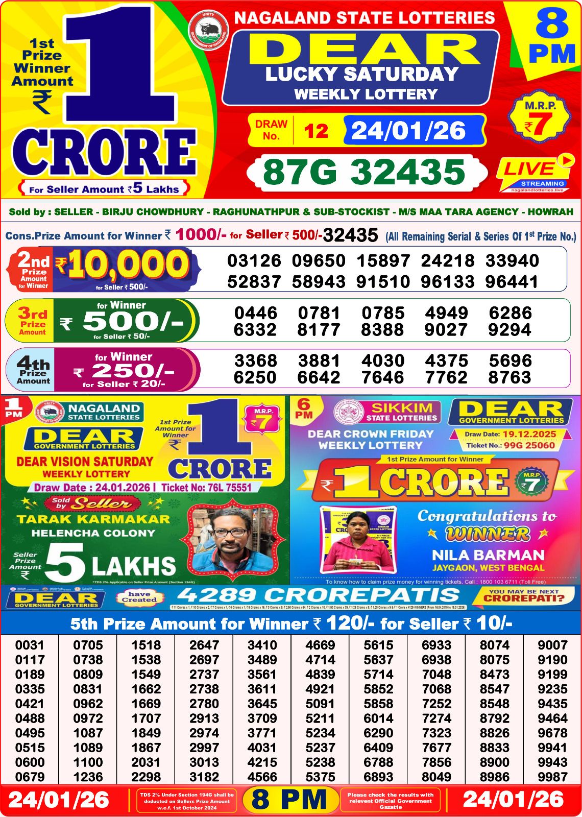 Nagaland Lottery Sambad Result for Dear Lucky Saturday weekly lottery result 8 PM – 24/01/2026 is now published here. Check Your Numbers Here.