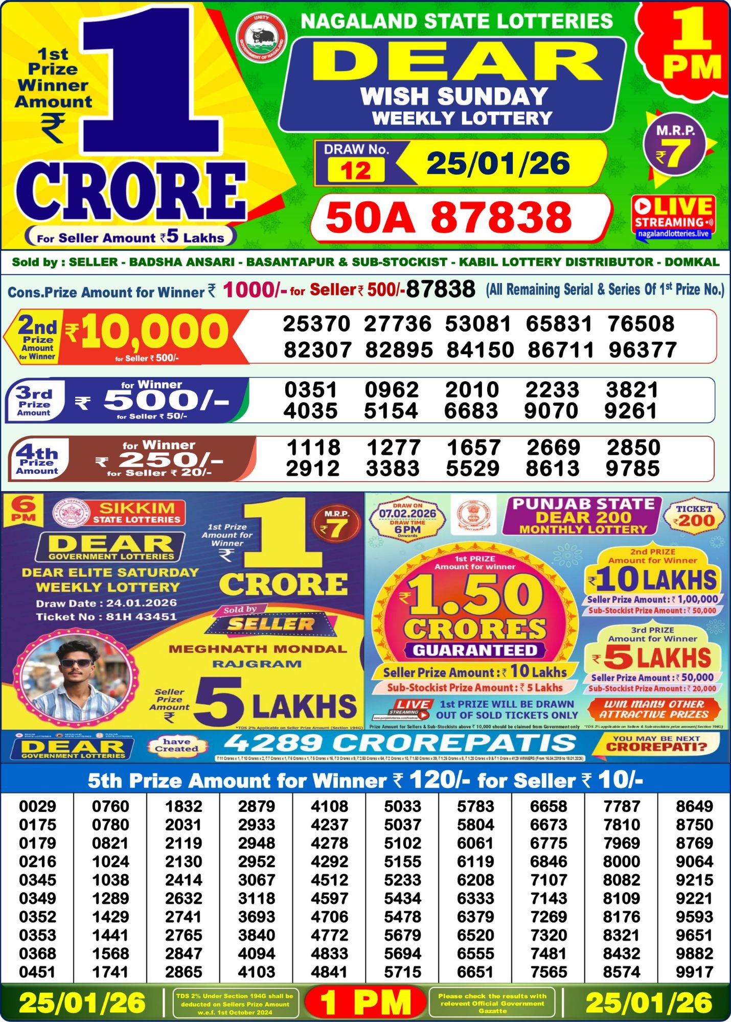Nagaland Lottery Sambad Result for Dear Wish Sunday weekly lottery result 1 PM – 25/01/2026 is now published here. Check Your Numbers Here.