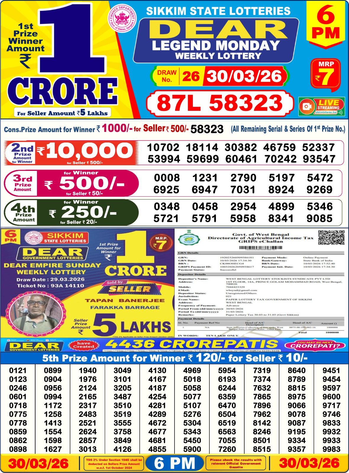 Sikkim Lottery Sambad Result for Dear Legend Monday weekly lottery result 6 PM – 30/03/2026 is now published here. Check Your Numbers Here.